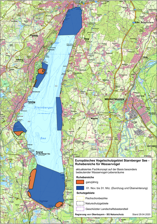 Ab 1. November sind alle blau (orange ganzjährig) markierten Flächen im Starnberger See für zahlreiche Aktivitäten verboten, um Wasservögel zu schützen.